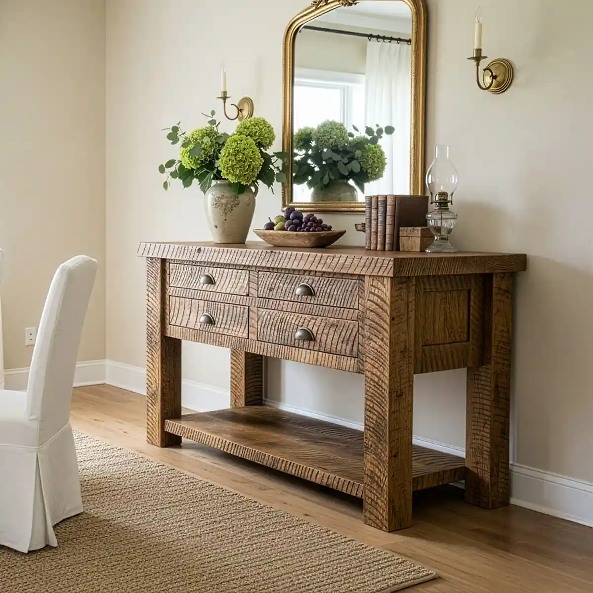This sideboard table is hand crafted from solid oak. Solid hardwood face frame, top, inlayed sides, & soft-close dovetail drawers. The drawer pulls are aged brass hardware. Solid 4″x4″ legs & bottom storage shelf. This piece comes fully assembled & ready for use.