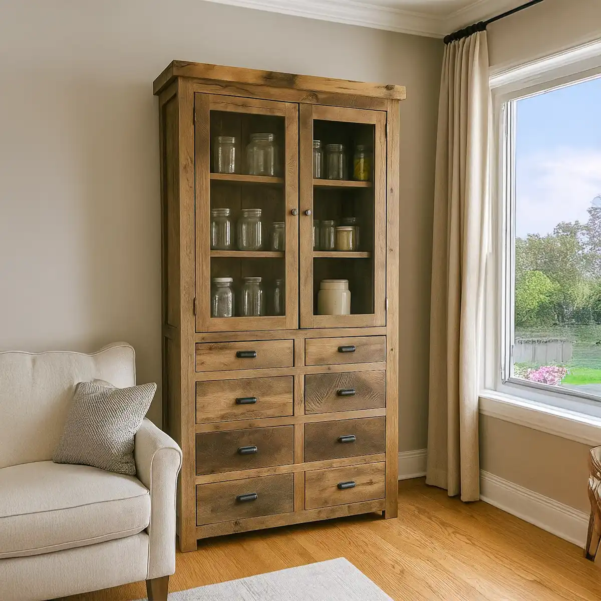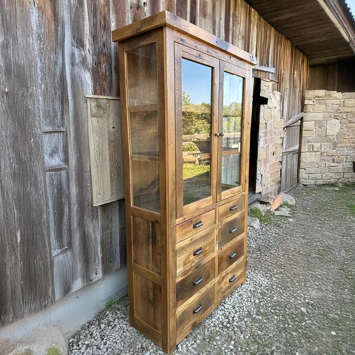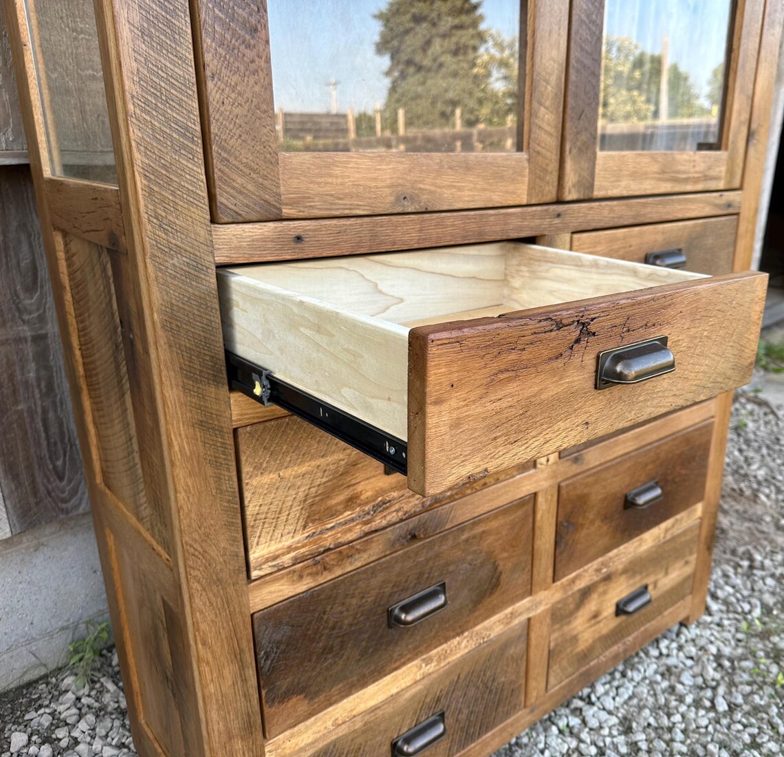 This cabinet is hand crafted from reclaimed oak barnwood. The face frame, sides, & top are solid hardwood with inlayed glass doors. Inlayed glass side panels. The doorknobs & drawer pulls are aged brass hardware with soft-close hinge doors. (2) Adjustable Shelves