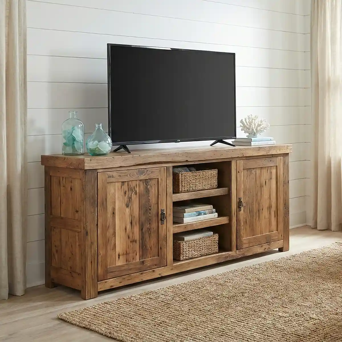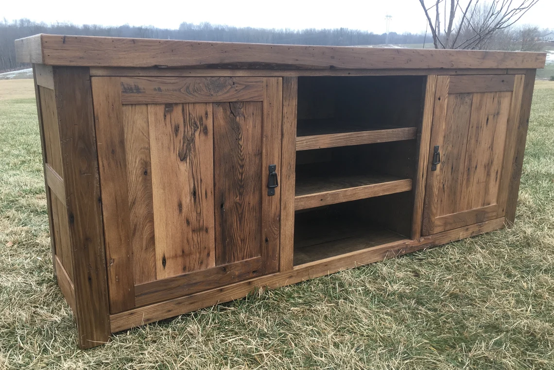 This console is hand crafted from 100 year old reclaimed wormy chestnut barnwood. Solid hardwood face frame, top, inlayed sides & doors. The door knobs are aged brass hardware & quality high end soft close door hinges. Adjustable shelving & centered holes in the backing of middle opening for wire/cord access. This piece comes fully assembled & ready for use.