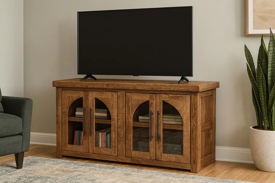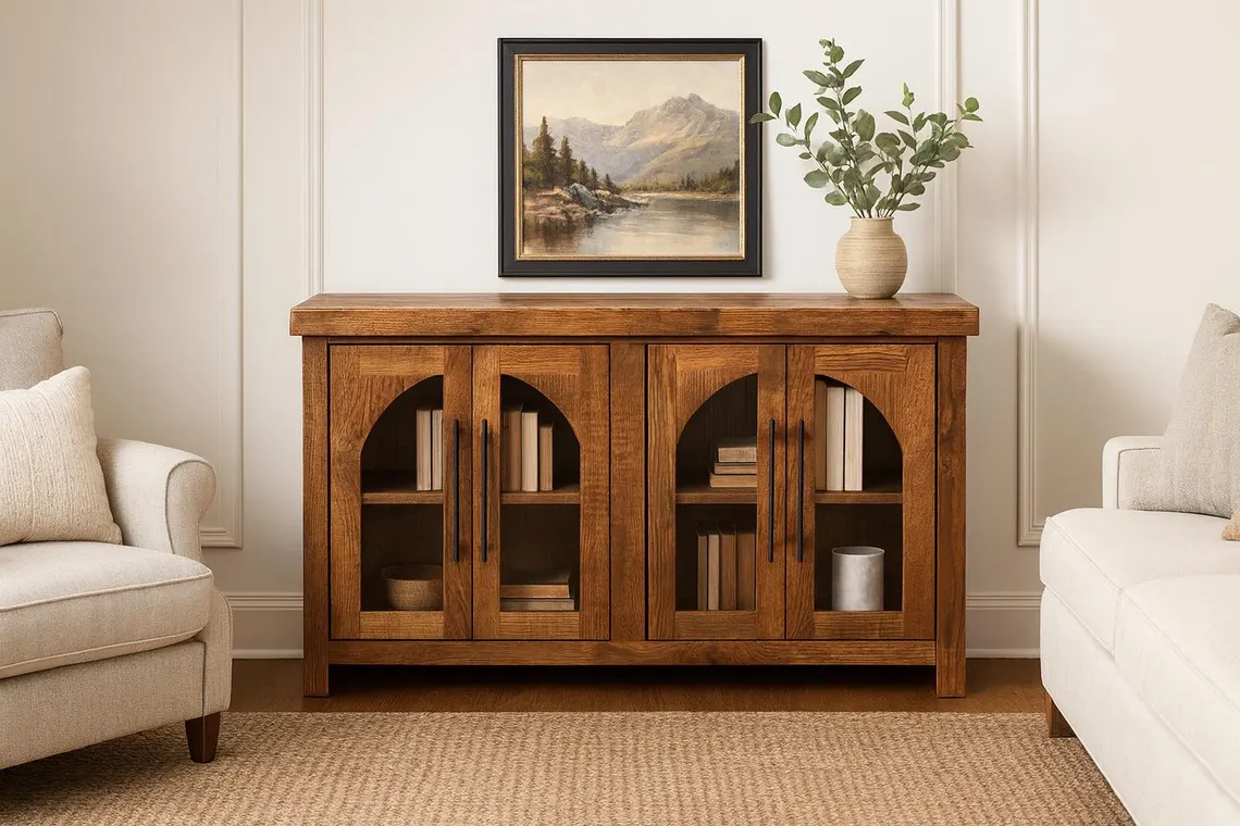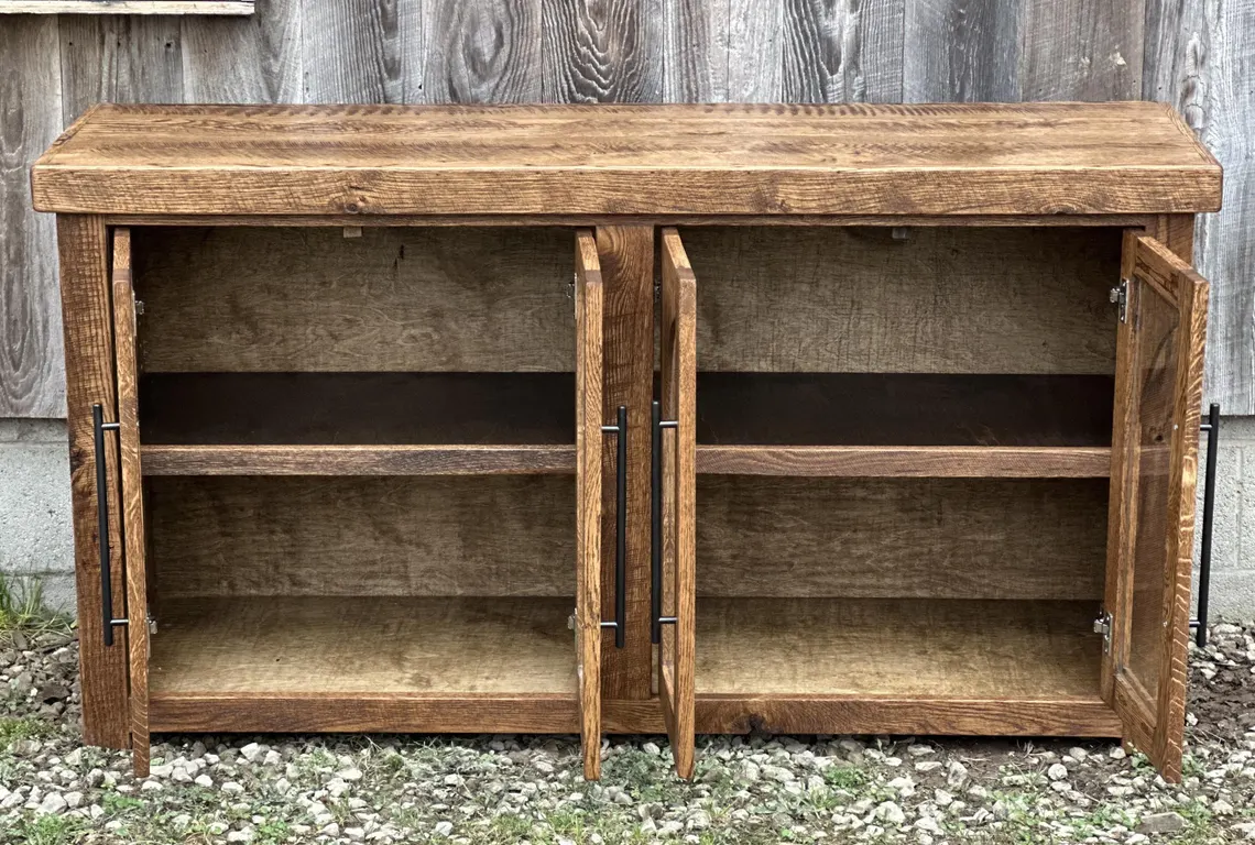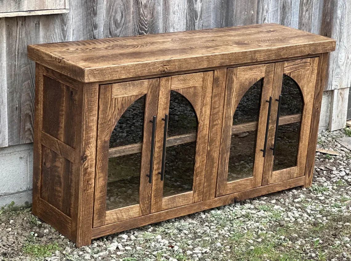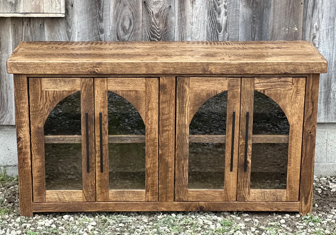 Solid Oak Console Table: 60″ Handcrafted Media/TV Cabinet – Glass Doors – Ready to Ship!