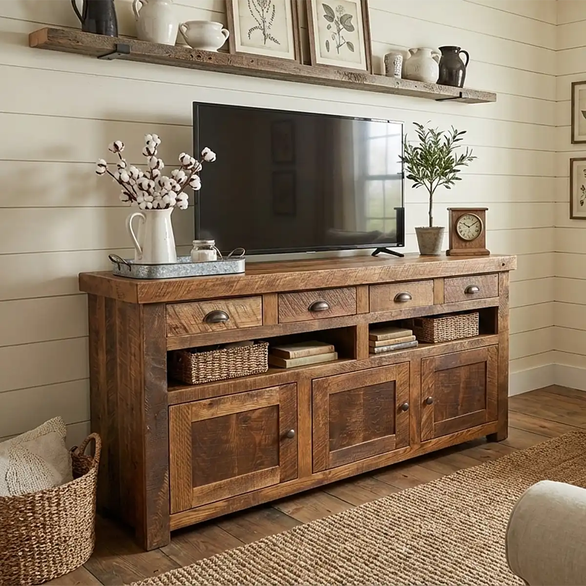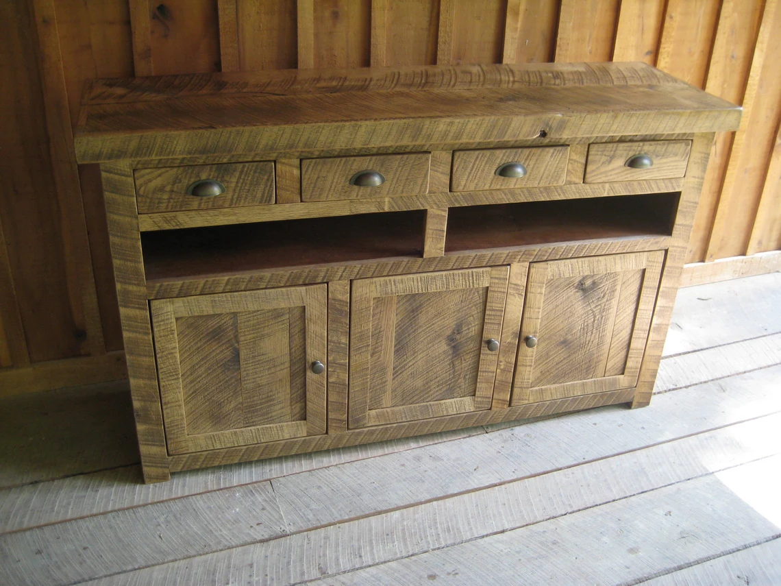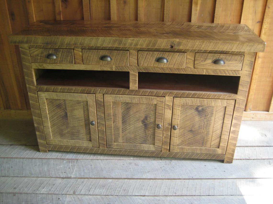 This tv console is hand crafted from solid oak. The drawer pulls & door knobs are aged brass hardware. Centered holes in the backing for wire/cable access. Adjustable shelf inside door openings.
